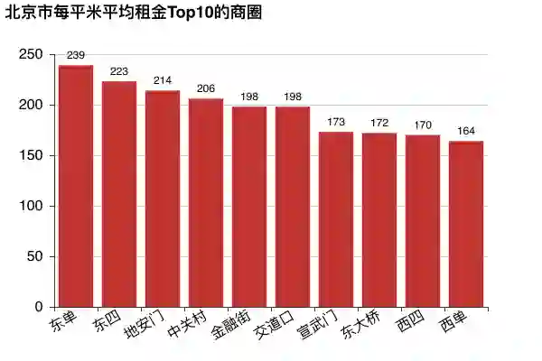 北京每平米平均租金前10的商圈,租金在每平米200元左右徘徊。最贵的商圈东单,每平米要239元,也就意味着,在东单租一个30平的房子,一个月需要7170块钱,租一个80平的房子,一个月需要19120元。