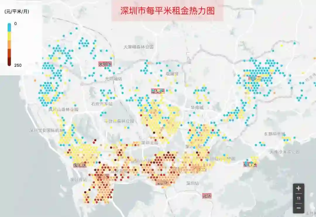 深圳每平米租金大于100元的房源主要集中在南山区(深大、深圳湾、科技园)、福田区(特别是梅林和香蜜湖)、以及罗湖区。宝安、龙华、布吉主要以每平米租金50-100元为主,11号线碧头端以及龙岗区主要以每平米租金50元以内为主(是不是有很多小伙伴愿意租在这里,搭地铁去市区上班的?)。