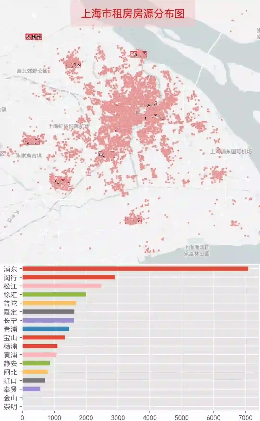 上海也一样,除了周边的宝山、嘉定、青浦、松江、奉贤等区中心有房源外,房源主要集中在中心城区+浦东(地铁网范围内)。总共27311条房源,浦东就有7000多条,比例超过1/4。
