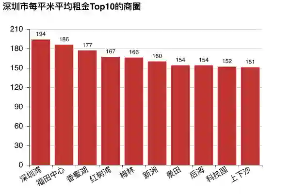 再看前10的商圈,果然深圳湾以每平米租金194元领先,然后是福田中心和香蜜湖。