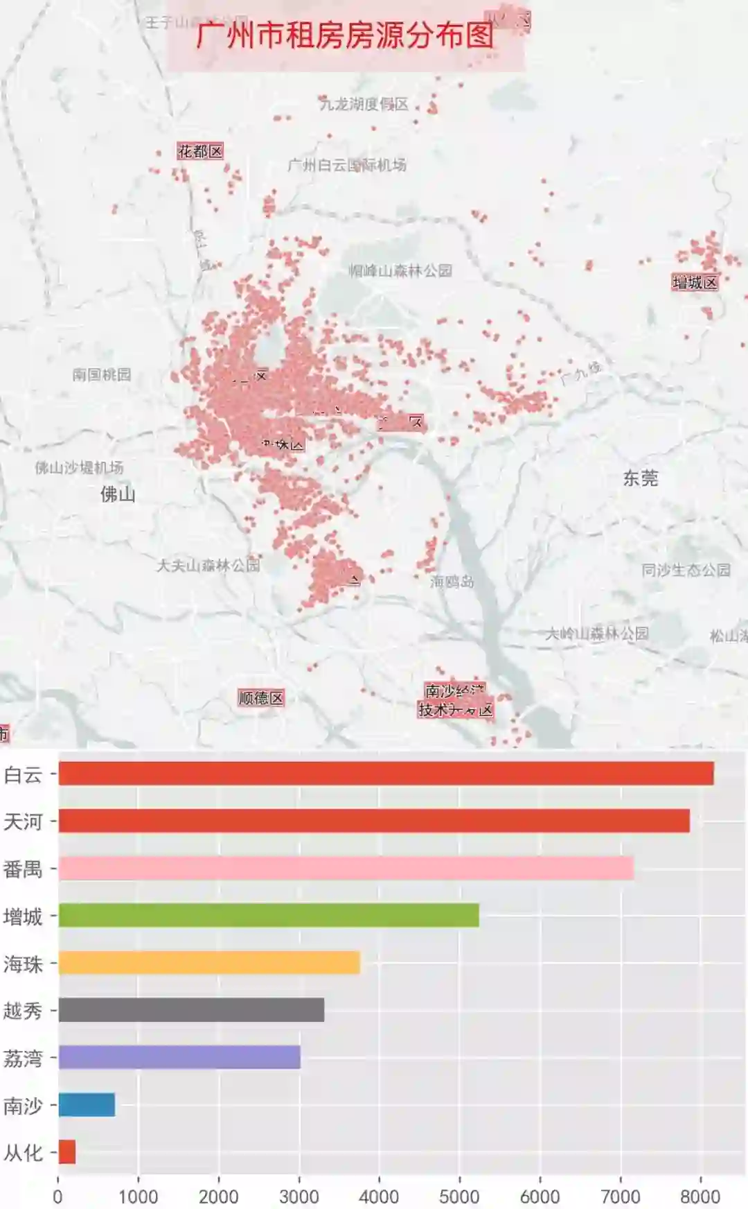 (注:由于链家广州各区的商圈有交叉,所以广州各区的房源数量稍有偏差)