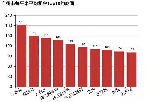 广州前10的商圈每平米月租金相较北京上海也是整体便宜。最贵的是越秀的二沙岛181元,以及解放北和人民北,再者是天河的珠江新城。