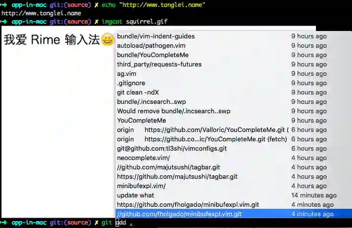 1. git: 当前目录若是在一个 git repo 下面的话,会自动显示当前的分支信息等等。然后可以自己搞一些 alias,简写命令,比如石头常用的一些: