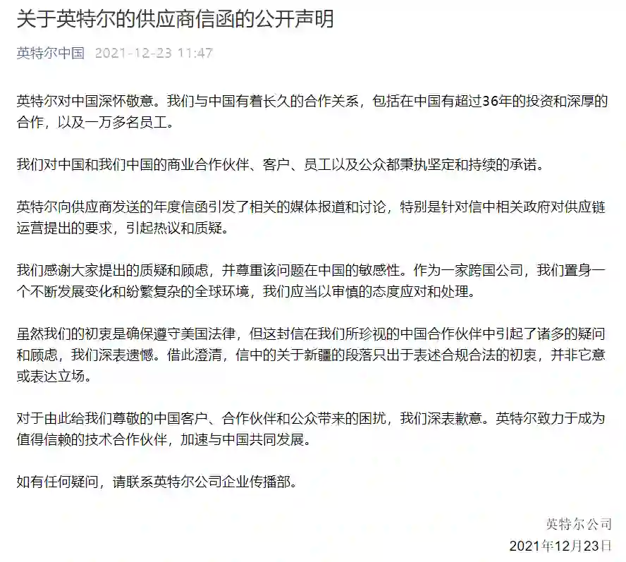 本司在知悉英特尔品牌致信供应商禁用新疆产品后,第一时间与英特尔品牌方取得联系并进行多次严肃沟通,向其明确提出表明正确立场等要求。但经过反复沟通,截至目前,英特尔品牌也仍未公开表明其立场和态度。