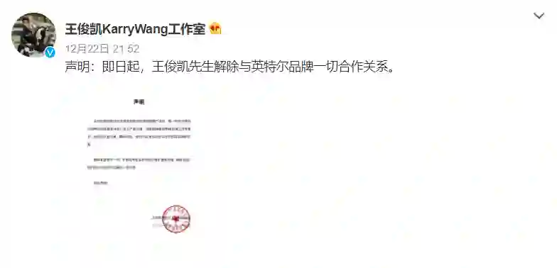 国家利益高于一切!王俊凯先生及本司坚决维护国家利益,故即日起,我们终止与英特尔品牌的一切合作。