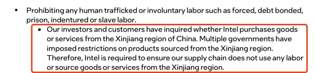 我们的投资者和客户已询问英特尔是否从中国新疆地区采购产品或服务。多个国家与地区的政府已对来自新疆地区的产品实行限制。因此,英特尔需要确保我们的供应链不使用任何来自新疆地区的劳工、采购产品或服务。