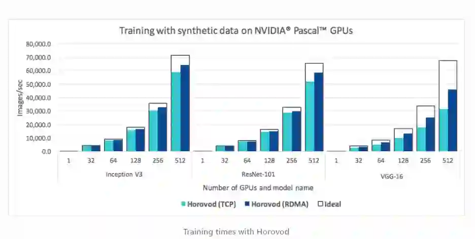 在测试中,我们发现 Horovod 速度大大快于 DistributedTensorFlow 和 PyTorch DistributedDataParallel。尽管如此,PyTorch 还是在积极地开发,并在快速改进。在我们的测试中,我们发现 PyTorch DistributedDataParallel 在单台服务器上与 Horovod 相当,但是当扩展训练运行到多个服务器时(例如,4 个服务器,每个有 8 个 GPU),Horovod 的性能更好。