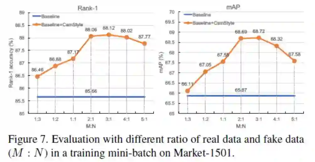 实验参数分析:一个重要的参数涉及到CamStyle的真假样本的比例M/N, 这个比例设置多少为好??通过改变这一比例,我们在图7中显示了实验结果。通过实验可以看出,我们无论比例设置为多少,加入CamStyle的结果都要高于Baseline。当在每个mini-batch中使用比真实数据更多的假数据时(M:N<1),我们的方法在rank-1精度上稍微提高了1%。当(M:N>1)我们的方法在rank-1精度方面提高了2%以上。通过实验我们设置最好的结果就是M:N=3:1