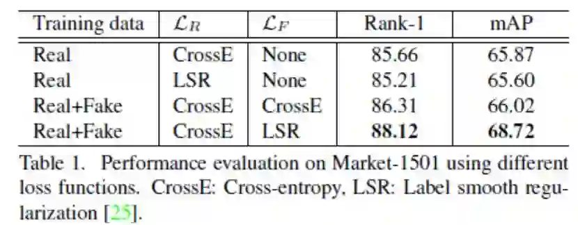 对于真实图像,我们不使用LSR,因为它们的标签与图像内容正确匹配。此外,我们通过实验证明,在真实图像中添加LSR并不能提高全摄像系统下的重新识别性能。所以对于真实的图像,我们使用单热标签分发。对于风格转移的图像,我们设置,损失函数