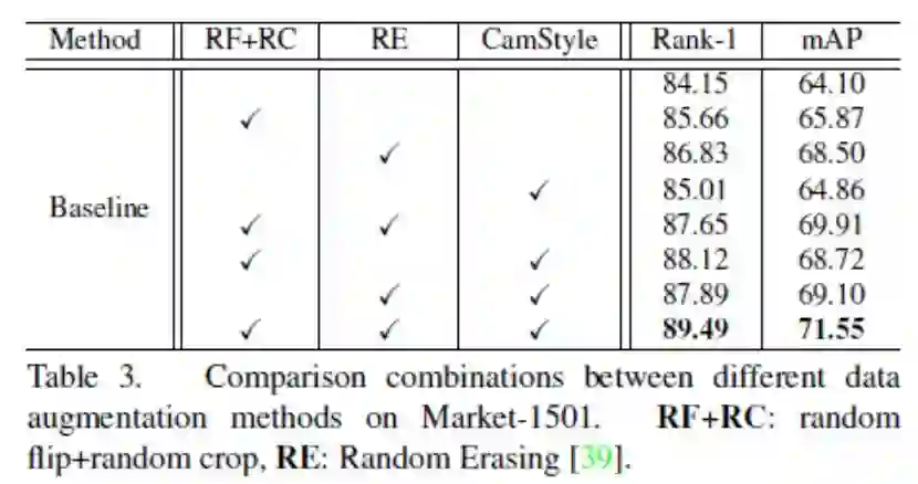 为了进一步验证CamStyle,我们将它与两个数据增强方法进行比较, random flip + random crop(rf+rc)和Random Erasing(RE)。rf+rc是CNN训练中常用的一种技术,以提高图像翻转和物体翻译的鲁棒性。RE的设计是为了使不变性成为不变性。如表3所示,当不使用数据增强时,rank-1的精度是84.15%。当只应用rf+rc、RE或CamStyle时,rank-1的精度分别提高到85.66%、86.83%和85.01%。此外,如果我们将CamStyle与rf+rc或RE组合在一起,我们会观察到它们各自的使用情况的持续改进。最好的性能是在三个数据增强方法一起使用的时候实现的。因此,虽然这三种不同的数据增强技术关注的是CNN不变性的不同方面,但我们的研究结果表明,CamStyle与其他两个方面是互补的。特别地,结合这三种方法,我们达到了89.49%的rank-1精度。