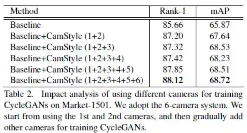 在表2中,我们展示了使用更多的摄像头来训练相机感知的样式传输模型,rank-1的精度得到了提高。from 85.66% to 88.12%.特别地,我们的方法在rank-1精度上得到了+1.54%的改进,即使只使用第1和第2个摄像头来训练相机感知的样式传输模型。此外,当使用5个摄像头训练相机风格的传输模型时,它的rank-1精度为87.85%,比使用6个相机的准确率低0.27%。这表明,即使使用摄像机的一部分来学习相机感知的样式传输模型,我们的方法也可以产生大约相同的结果来使用所有的摄像头。