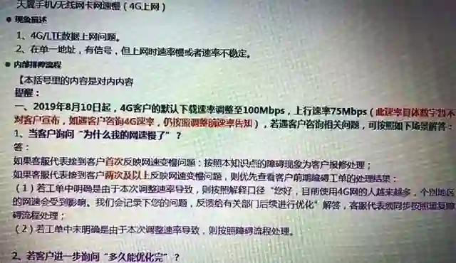 近日,一张在微信群中被广泛转发的“内部员工关于4G网速慢的应对话术”截图显示,8月10日起,4G用户默认下载速率调整至100Mbps,上行速率75Mbps,但该数字不对客户宣布,如遇客户咨询仍按调整前速率告知。
