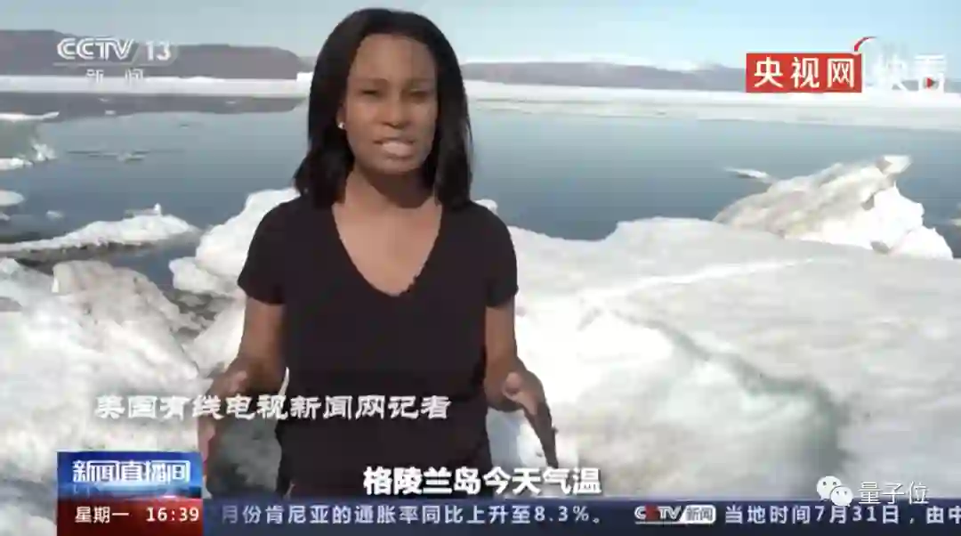 画面中,国外记者(CNN)虽站在格陵兰岛、背靠冰雪,但却身着一件单薄的T恤,并且还表示: