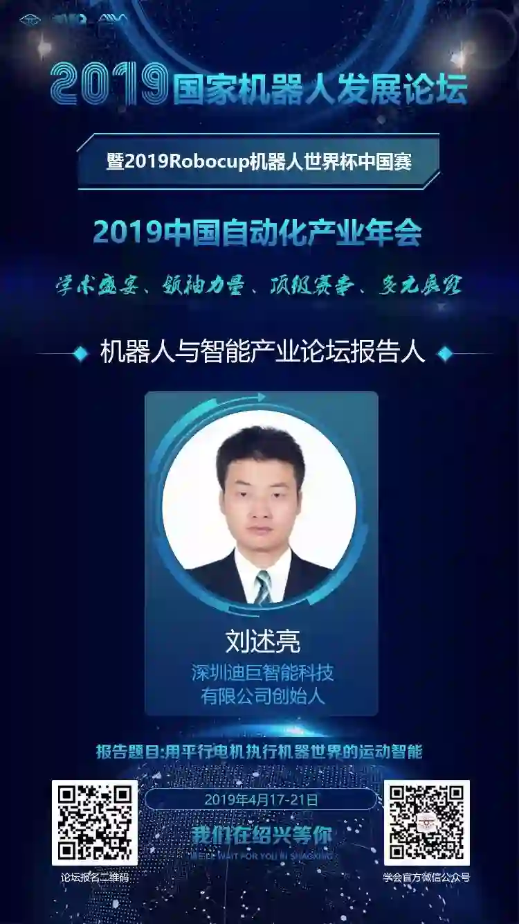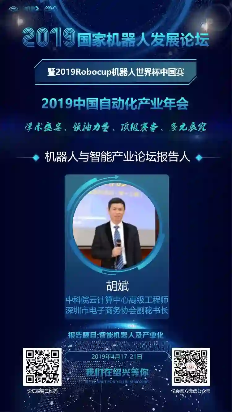 2019国家机器人发展论坛暨Robocup机器人世界杯中国赛以及2019年中国自动化产业年会将于2019年4月17-21日在绍兴组织召开,同期将开展科技成果展示,聚焦多种类智能机器人的发展,应用与创新,壮大中国机器人事业,为实现中国制造强国梦而作出贡献。此次活动由中国自动化学会、中共绍兴市委组织部、中共绍兴市柯桥区委、绍兴市柯桥区人民政府主办,中国人工智能产业发展联盟(AIIA)联合主办。