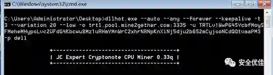 挖矿程序运行后,连接控制服务器挖矿消耗计算机资源,使CPU占用率极高。此病毒没有使用常用的xmrig挖矿,而是使用了另一个开源的挖矿程序JC Expert Cryptonote CPU Miner修改而来。
