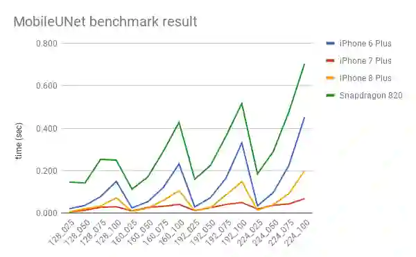 因此,如果你想要发布基于移动设备的深度学习应用,最好先在主流的设备上做一下测试。接下来,我要分享一下 MobileUNet 的各种指标。