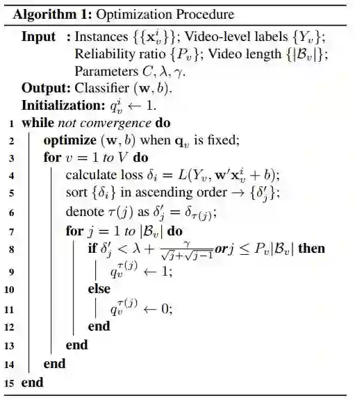 为此,我们提出了一种新的MIL方法,它同时学习线性SVM分类器,并推导出每个实例的二元归类,以便从每个正或负包中选择可靠的训练实例。在我们新的目标函数中,我们平衡了加权训练误差和l1-l2混合范数正则化条件,从而可以自适应地从不同视频选择可靠的镜头作为训练实例,使他们尽可能多样。我们还开发了一种能有效解决我们所提出目标函数的交替化方法。