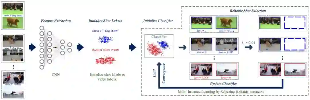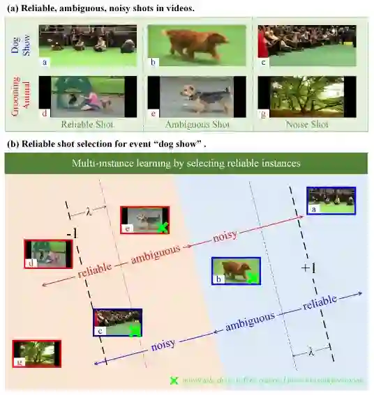 复杂事件检测的目标是自动检测一个事件是否发生在临时未修剪的长视频中,这些视频通常由多个视频镜头组成。记正面的(负面的)视频中观察一些视频镜头与给定的事件类无关(相关),我们将每个视频作为一个包,并将视频中的视频镜头作为实例,将此任务作为多实例学习(MIL)问题来制定。