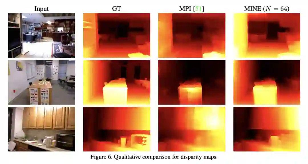 在 RealEstate10K,KITTI 和 Flowers Light Fields 数据集上的实验表明,MINE 在新视角合成的性能上大幅超越了当前最前沿的方法。同时,在 iBims-1 和 NYU-v2 的实验表明,团队在没有使用真值深度做监督训练的情况下,获得了和前沿方法接近的深度估计性能。