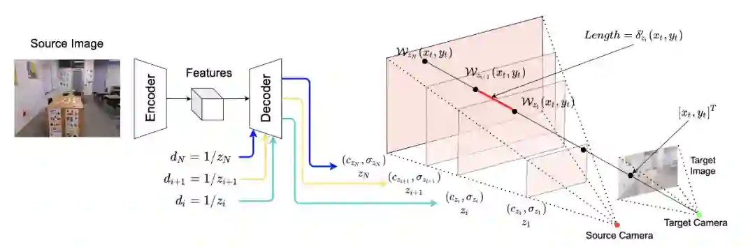 利用 homography wrapping 建立像素点间的 correspondence。可以想象,从 target 相机射出一条光线,这条光线与 target 图片的一个像素点相交,然后,研究者延长这条射线,让它与 source 相机视锥的各个平面相交。相交点的 RGB-sigma 值可以通过 bilinear sampling 获得;