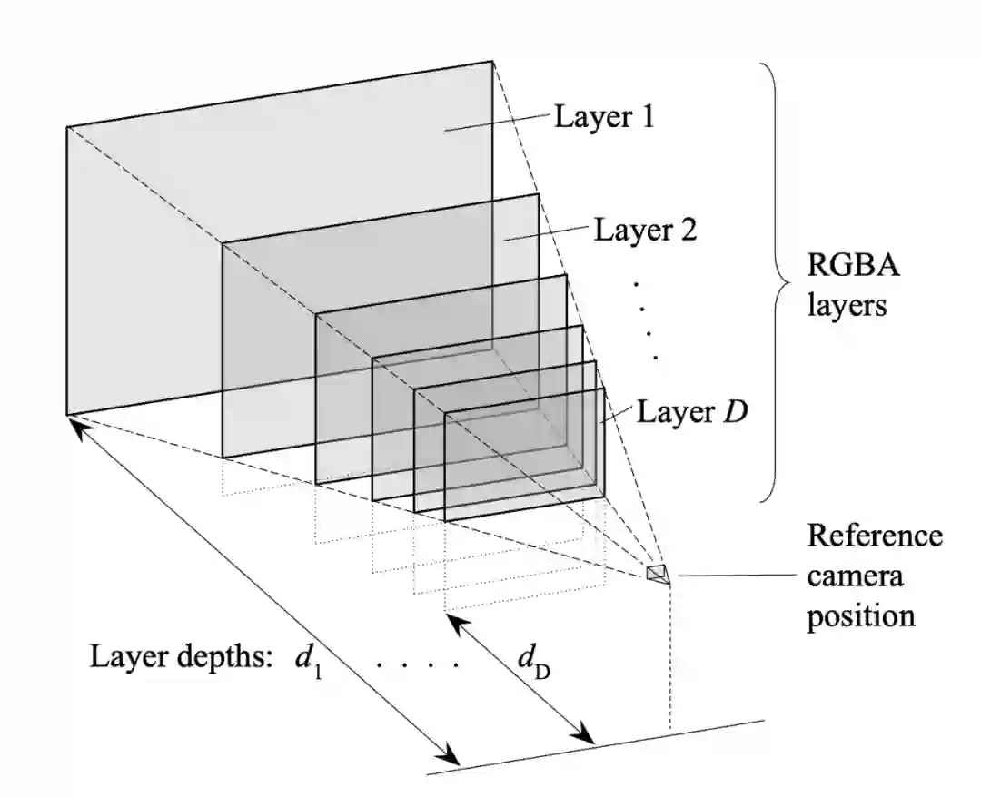 另外一个与该研究较相关的是 MPI(Multiplane Image)[1, 2, 3]。MPI 包含了多个平面的 RGB-alpha 图片,其中每个平面表达场景在某个深度中的内容,它的主要缺点在于深度是固定及离散的,这个缺点限制了它对三维空间的表达能力。[1, 2, 3] 都能方便地泛化到不同的场景,然而 MPI 各个平面的深度是固定且离散的,这个缺点严重限制了它的效果。