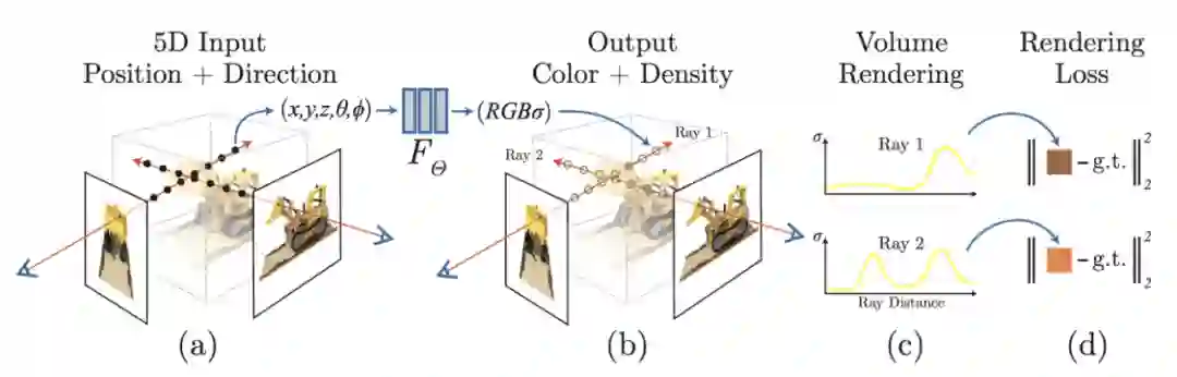 近年来,在新视角合成这个领域里,最火爆的方法无疑是 ECCV 2020 的 NeRF [5]。与传统的一些手工设计的显式三维表达(Light Fields,LDI,MPI 等)不同,NeRF 把整个三维空间的几何信息与 texture 信息全部用一个 MLP 的权重来表达,输入任意一个空间坐标以及观察角度,MLP 会预测一个 RGB 值和 volume density。目标图片的渲染通过 ray tracing 和 volume rendering 的方式来完成。尽管 NeRF 的效果非常惊艳,但它的缺点也非常明显: