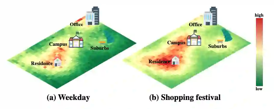 购物中心和商店的空间分布、人口的分布属性以及不同的日期类型(例如,工作日,周末或购物节)等因素,将会导致不同的购物方式,如图1所示。由于来自某个特定区域以及特定时间范围内的数据过于稀缺,我们无法仅使用某个范围的数据去训练一个高精度的预测模型。同时,城市中不同区域的人口密度和分布特征高度异质,并且随着时间的推移区域特征也会发生变化,对这样复杂的时空购买模式进行建模是一个非常困难的任务。为了准确地捕获区域的空间特性,它需要考虑一组综合的空间特征,例如兴趣点(POI)分布,区域的人口统计特征等。如何通过跨时空建模学习提升单个区域在特定时间段的预测精度是我们的主要任务。