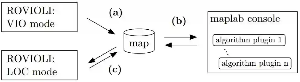 流程内部(process-internal)的发布者-使用者(publisher-subscriber)数据交换层管理着ROVIOLI内所有模块之间的数据流。这种结构使得在用新的算法去扩展当前的在线线程很容易,例如用在线的多节点建图(online multiagent mapping),语义SLAM(online multiagent mapping)或定位(localization)研究。