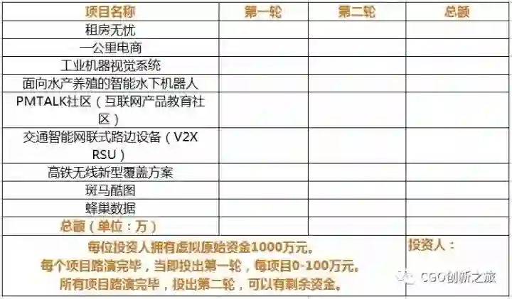 首先,主持人李华刚拿出一张幺蛾子的打分表:“鸡血表”。假设每位评委有1000万虚拟投资,在每个项目路演完毕,立即投出0-100万”资金;所有项目路演结束后,评委把剩下的资金自由地投给给心仪的项目。