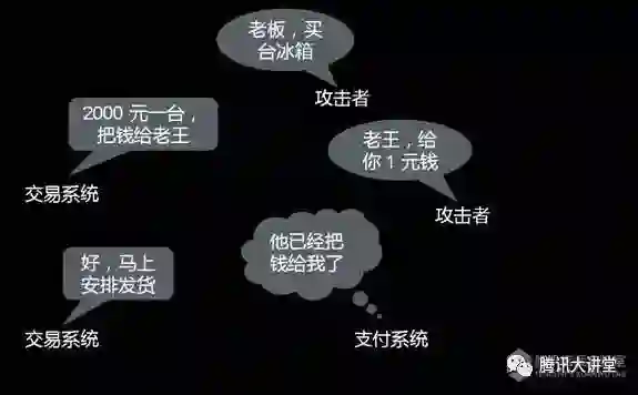 我们再来讲一下软件系统之间的耦合。有一个非常经典的例子,国内中小电商,一半以上在早年都犯过这个错误,现在基本都修复了。电商的交易和支付系统之间流程是这样,一个人过来说老板我要买一台冰箱,多少钱?两千。OK,你把钱付给支付系统。因为支付请求也是在用户侧的浏览器里提交的。这个过程对用户是不可见的,但攻击者实际上可以修改这个数据。攻击者可以修改浏览器提交的数据,本来交易系统让他提交2000元,攻击者改为提交1元,然后支付系统就返回OK,说我收到钱了。这个OK到交易系统那里,交易系统一看支付成功了,那就安排发货,1元钱就把冰箱买到了。