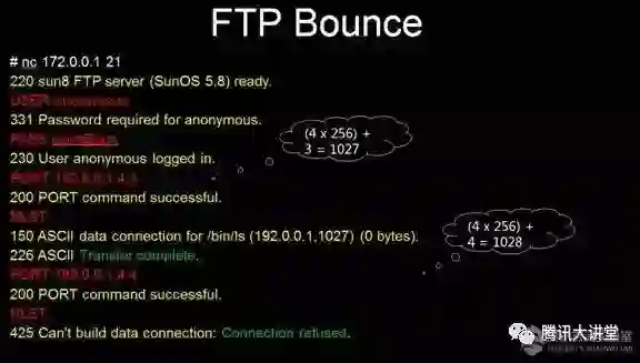 主动模式FTP的协议是这样工作的。首先我们连接到172这台机器,假设它是FTP服务器——今天是创新日,大家看这也是一个微创新,这页PPT里的击键仿真动画不是嵌入的视频,是用PPT自带的功能来实现的——登录进去,服务器返回说OK,你登录进来了。192这个机器假设是内网的一台机器,我们没有办法直接访问它,可能它是一台重要的,受保护的机器。但是这种FTP的协议本身允许用户设定自己的IP。你去访问一个FTP服务器,它当然可以知道你客户端IP是什么,但服务器允许你指定另一个IP作为你的IP。当然,这种设计有其合理原因,在这里不过度展开,大家只要知道它允许这样做就可以。红色的字都是攻击者的命令。成功了。这意味着FTP服务器在这条命令之下连接了192这台机器的1027端口,并且把执行结果发到了内网那台机器上。