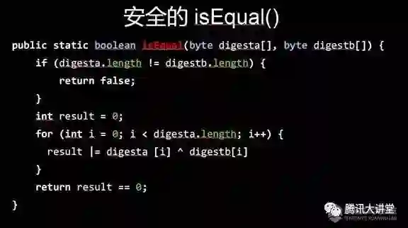 安全的设计是什么样子?这是改进后的写法。无论传递进来的密钥是什么样子的,是有几个字节对,是有几个字节不对,它处理的时间是完全一致,攻击者没有办法对通过时间差攻击来进行密钥猜解。