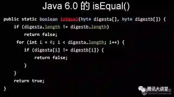 这是Java 6.0消息摘要类中的一个函数,用来验证HMAC等数据。在这个函数本身设计的时候,这种写法可能还不被认为有太多问题,在座各位看这个函数可能也觉得没什么问题。但如果我们用刚才的这个函数去验证一个重要数据,假设digesta是我们掌握的密钥,用户传递的密钥是digestb,实际上用户可以用逐字节穷举的方式很快探测出真正的密钥。我们看这个函数是怎么验证比较的呢?它是一个字节一个字节比较的。第一个字节不正确,它立即就会返回失败。如果第一个字节是对的,就比较第二个字节。所以,如果用户传递过来的密钥第一个字节是对的,和第一个字节是不对的,这个函数返回的时间会有一个微小的差异,整个指令执行周期会多一点。在这种情况下,攻击者本来要把所有数据都猜对才可以破解出这个密钥,而这是几乎不可能的。但是现在他可以一个字节一个字节猜,一下子把猜解速度提高无数倍。