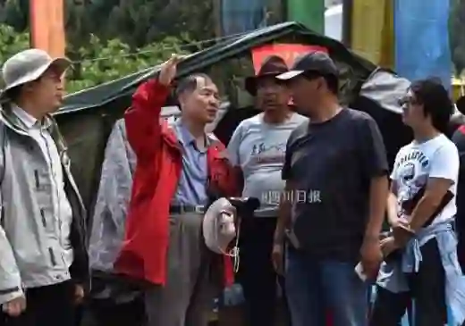 中科院院士崔鹏(红衣)与中科院成都山地灾害与环境研究所专家陈晓清(左一)在树正寨了解受灾情况