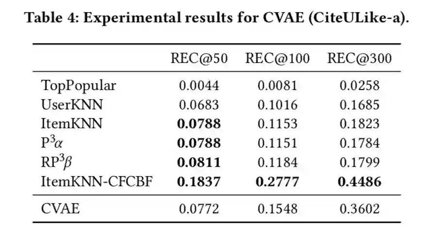 通过将可复现的 7 个方法与基准方法在相同数据集上进行测试,可以评估这些可复现方法的真实性能。这里主要评估之前挑选的7中可复现方法,其中只有Collaborative Variational Autoencoder(CVAE)能在同等训练条件下超越传统方法,其他算法都不如同等测试条件下的传统方法。