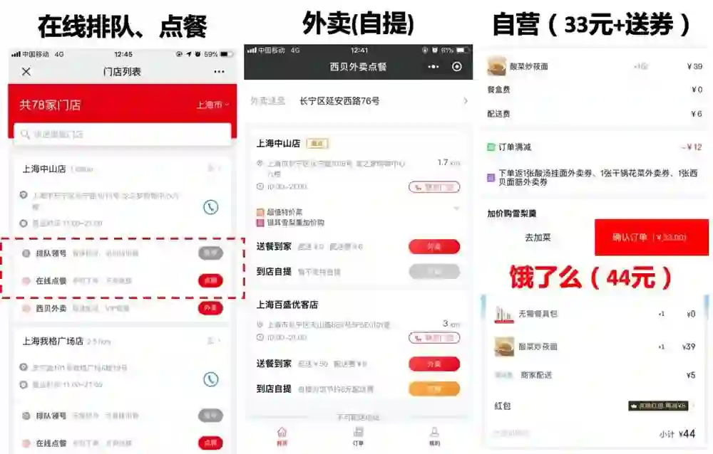 除了电商平台和付费会员外,西贝还搭建了自营的排队、点餐和外卖系统。同一道菜品“酸菜炒莜面”,因为少了平台佣金,自营的价格比饿了么整整省11元。