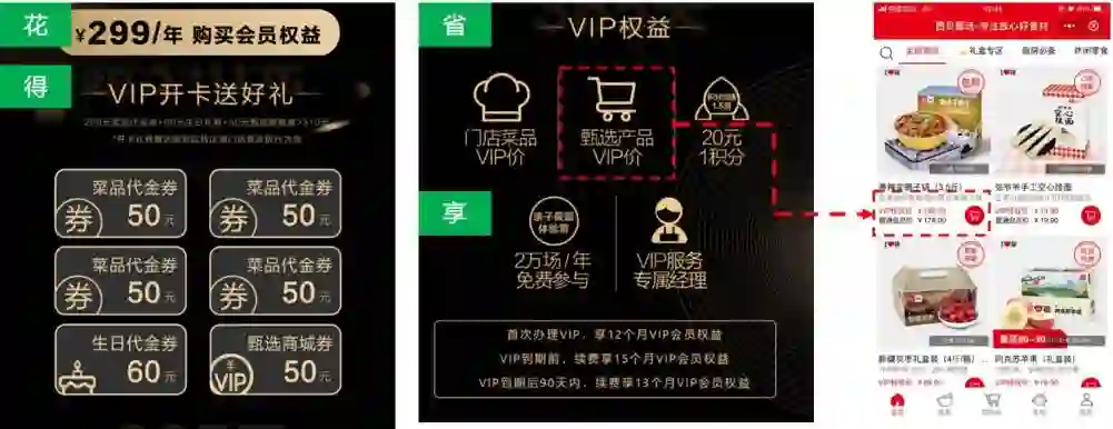 省:门店菜品VIP价+甄选产品VIP价,一个是线下折扣(每道菜省2-5元),一个是线上折扣(7-8折),消费者省钱非常直观。