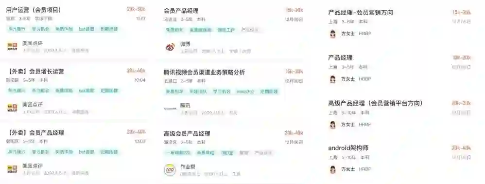 会员运营、会员产品经理等会员相关岗位缺口巨大。工作3-5年的会员岗,美团点评、新浪微博、腾讯都开到了20-40K的薪水。即使在同一家公司,同样是3-5年的产品经理,会员方向的薪水也高出了5-10K。会员相关岗位的薪资已经与程序员一样,成为互联网行业薪资最高的群体,而且有很大的发展空间。