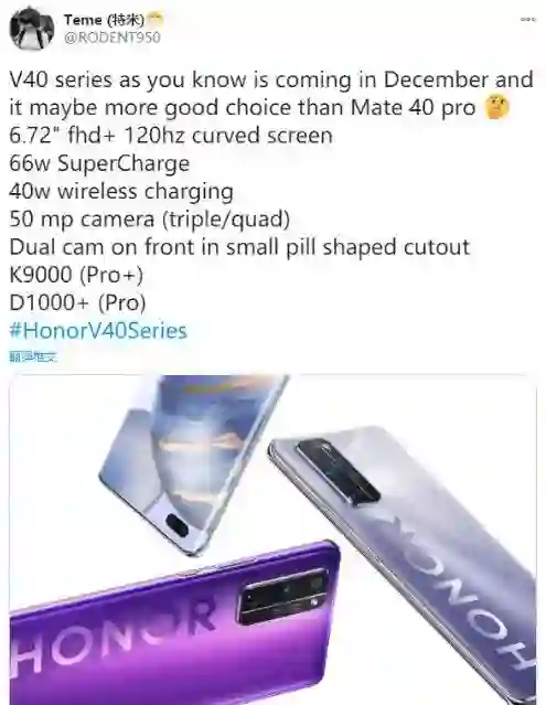 - 荣耀 V40/V40 Pro 搭载天玑 1000+