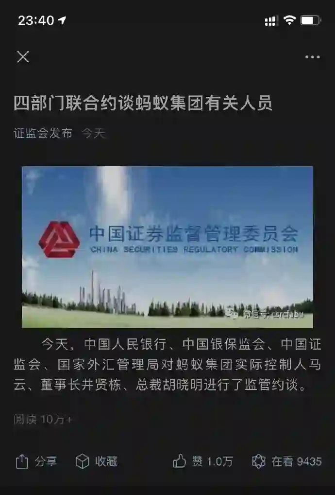 昨日中国人民银行、中国银保监会、中国证监会、国家外汇管理局对蚂蚁集团实际控制人马云、董事长井贤栋、总裁胡晓明进行了监管约谈。(来自证监会发布)