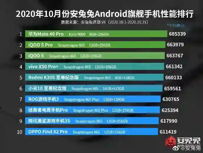 安兔兔公布 10 月安卓手机性能榜:华为Mate40 登顶榜首。华为 Mate 40 Pro 平均成绩 685339,性能模式下部分 Mate 40 Pro 跑分为 70 万以上。