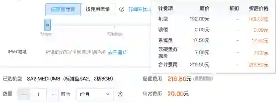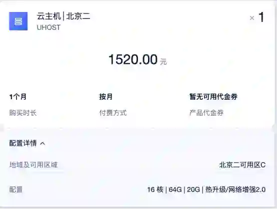 在价格查询时,我们发现,由于进入UCloud主机创建页时,若不调整选项,默认带1Mb外网带宽和20GB数据盘,三个配置项叠加的总价和《选型指南》表中展示的一致。以2核8G举例,227元/月正是在《选型指南》列出的UCloud快杰型价格。
