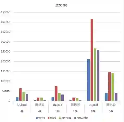 本次测试我们使用的iozone工具对文件系统进行多个不同大小的io块进行测试,这里我们主要摘取了在4K/16K/64K的测试项下,磁盘每秒顺序读写和随机读写的操作吞吐量。