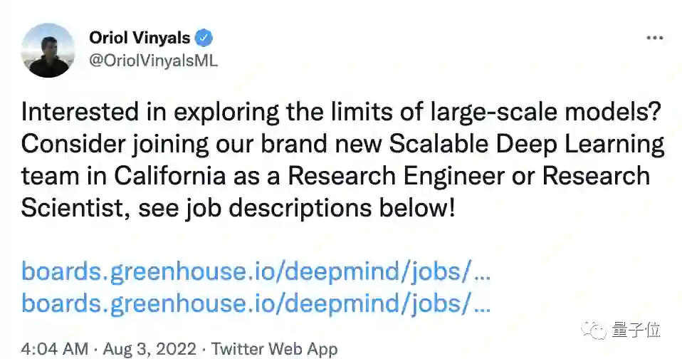DeepMind团队负责人Oriol Vinyals发推宣布,DeepMind成立了一个新的实验室,将致力于探索大规模模型的极限。