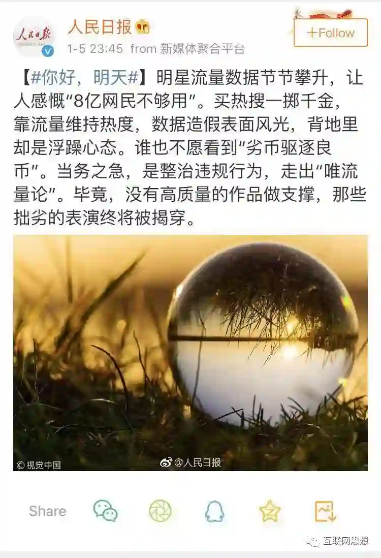 今年1月初,人民日报官方微博曾发文称,部分明星通过买热搜、造数据来维持自身热度,反映出娱乐圈浮躁心态。并提出,应加快整治新浪微博上数据造假相关违规行为,走出“唯流量论”。