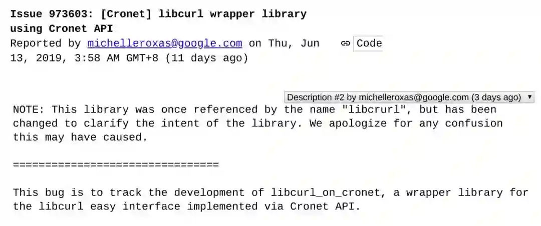 Chromium bug 团队近日表示他们将基于 Chromium 网络栈 Cronet 实现一个名为 libcrurl 的库,用来提供部分 libcurl API。对于 Daniel 来说,谷歌很可能是要实现一个他们自己的 curl,所以后边可能出现一个基于 libcrurl 的“crurl”。