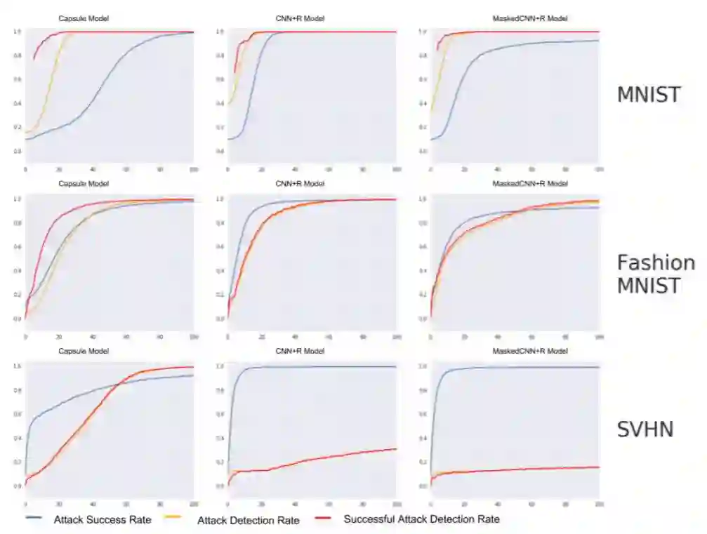 图 4:在不同时间步中,DARCCC 检测率和白盒 BIM 攻击成功率。从图中可以看出,当攻击成功率(蓝色)逐渐增大时,三个模型在 MNIST 和 Fashion MNIST 数据集上都表现不错,都能以很高的概率检测到对抗扰动和成功攻击的对抗扰动;而在 SVHN 数据集上,capsule 模型表现得更好。