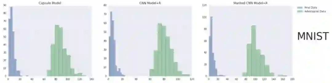 图 2:在 MNIST 的真实数据和对抗数据上,capsule 模型(图左)、CNN+R(图中)、Masked CNN+R(图右)的输入和重建样本之间的 L2 距离直方图。