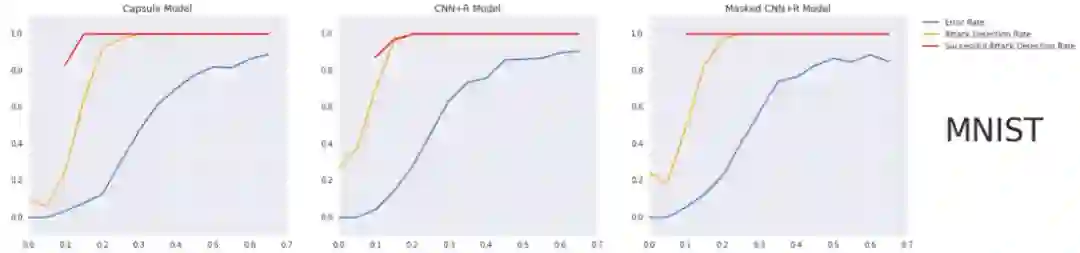 图 3 画出了三个模型的误差率、攻击检测率和成功攻击检测率。对于所有三个模型,DARCCC 不仅能准确地检测到成功改变类别的攻击(成功攻击检测率),还能检测到无论是否改变类别而进行的图像扰动(攻击检测率)。