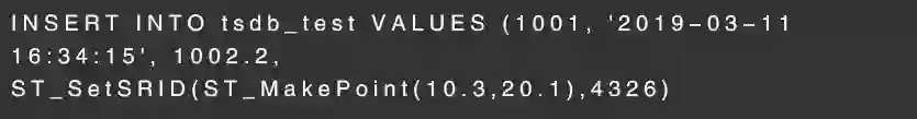 用户也可以通过psql交互式终端向时空数据库写入数据,下面是几个简单的例子:
